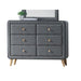 Sophisticated Design: The light gray fabric with black welt trim and natural wood accents provide a warm, inviting contrast, enhancing the dresser's timeless appeal and sophisticated appearance.