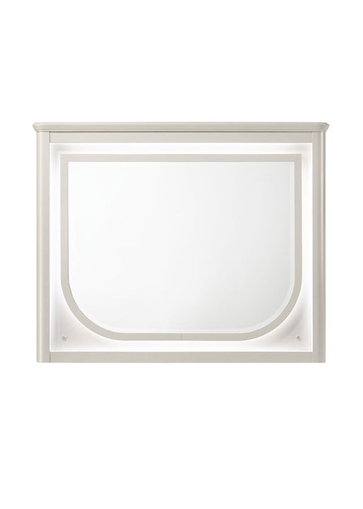 Elegant Design: The Edalene Pearl White Finish Mirror features a graceful arched silhouette with intricate scrolled trim and a rose crown dec...