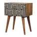 - Solid Wood Edessa Bone Inlay Bedside - This stunning boho-inspired bedside table is crafted from 100% solid mango wood and features a lovely finish. It also boasts bone inlay on the front drawers and sleek Nordic-style legs. The bone inlay is ethically sourced from deceased animals, including camels, goats, and buffaloes.