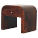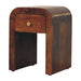 - Nightstand Solid Wood Mini Darcy with Curved Edges Artisan Furniture - Introducing the Mini Darcy Nightstand, a perfect blend of modern elegance and practicality. Handcrafted from 100% solid mango wood in a warm finish, this nightstand is designed with softly curved edges that exude a sleek, contemporary charm. Featuring a single drawer with a brass knob, it provides convenient storage while maintaining a clean and minimalist aesthetic. Its compact size and refined silhouette make it versatile for bedrooms, living spaces, or as a decorative accent. The Mini Darcy Nightstand combines timeless design with functionality, adding warmth and sophistication to any interior.