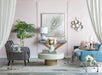 Artistic Design: Features a contemporary metal sculpture with a golden and white color scheme.