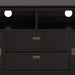 - Features a large centrally located open area with one (1) flip down drawer, one (1) pull out drawer as well as four (4) storage spaces with tempered glass doors.