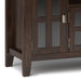 - Features a large centrally located open area with one (1) flip down drawer, one (1) pull out drawer as well as four (4) storage spaces with tempered glass doors.