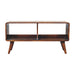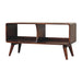 - Artisan Furniture Solid Wood Curved Chestnut Double Slot Media Unit - Our solid timber media unit is expertly constructed from 100% solid mango wood in a lovely chestnut finish. This modern piece offers a clean, open design with curved edges and nordic style legs. This style will allow you to display ornaments, and candles, or store any books or magazines in the living room.
