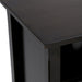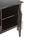 - Features tempered glass doors that open to cabinets with one (1) adjustable shelf each, three central drawers with metal drawer glides and open top space for media devices.