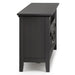 - Features a large centrally located open area with two (2) drawers as well as two (2) framed doors with enclosed spaces; the two (2) large side storage cabinets open to one (1) adjustable shelf each.
