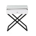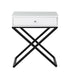 • Organize and declutter with the Koda side table. Place this table as a nightstand to your bed or as an end table in your living room. The one drawer with silver knob provides storage space for your everyday necessities. The finely crafted tabletop works perfectly for your lamp, picture frames, and any other decorative items for display. The MDF tabletop has a tempered glass for a contrasting material. The base is not only designed with an attractive black cross leg, but also solidly built with sturdy metal legs. Available in other colors that will complement your home's specific decor.