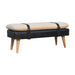 • Boucle Buffalo Hide Leather Bench - Derived from the French word for curled or ringed yarn or fabric. This handwoven upholstered furniture piece is made of 100% cotton and natural yarn, featuring buffalo hide leather to create a beautiful fusion of colours and materials. It has a belted strap design and also features solid wood legs which have and finish providing strength and durability.