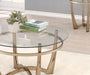 Modern Elegance: This coffee table features a champagne and clear glass design, embodying modern elegance with its round leg design and minimalist aesthetic. Its sleek appearance complements any decor.