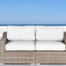 Durable Construction: Built with a powder-coated aluminum frame and wrapped in woven wicker, this loveseat is designed for durability and style, providing coastal vibes suitable for any porch or patio setting.